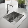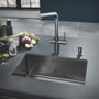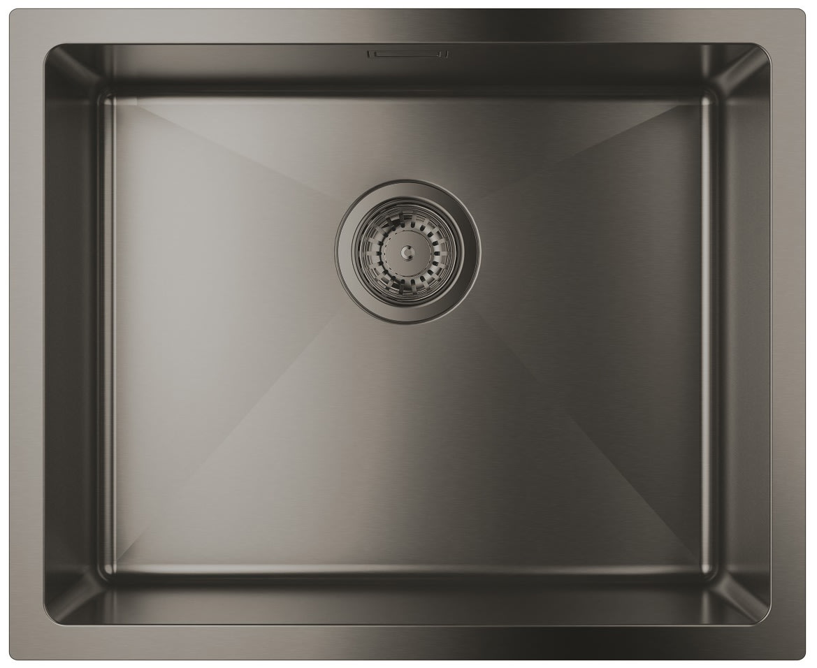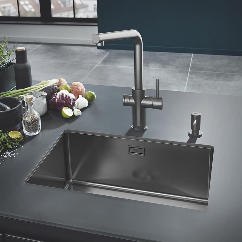 Elegant rustfri stålvask fra Grohe i børstet Hard Graphite. Alsidig montering: underlimet, nedfældet eller planlimet. Inkluderer kurveventil.