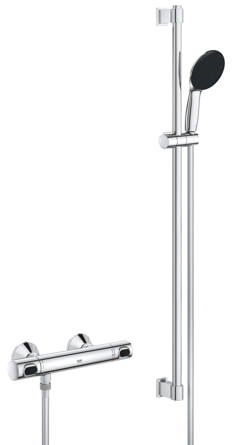Grohe Presicion Flow termostatbruser sæt med 2-grebs betjening, skoldningsspærre og vandbesparende funktion. Inkl. 900 mm bruserstang og 1750 mm bruseslange.