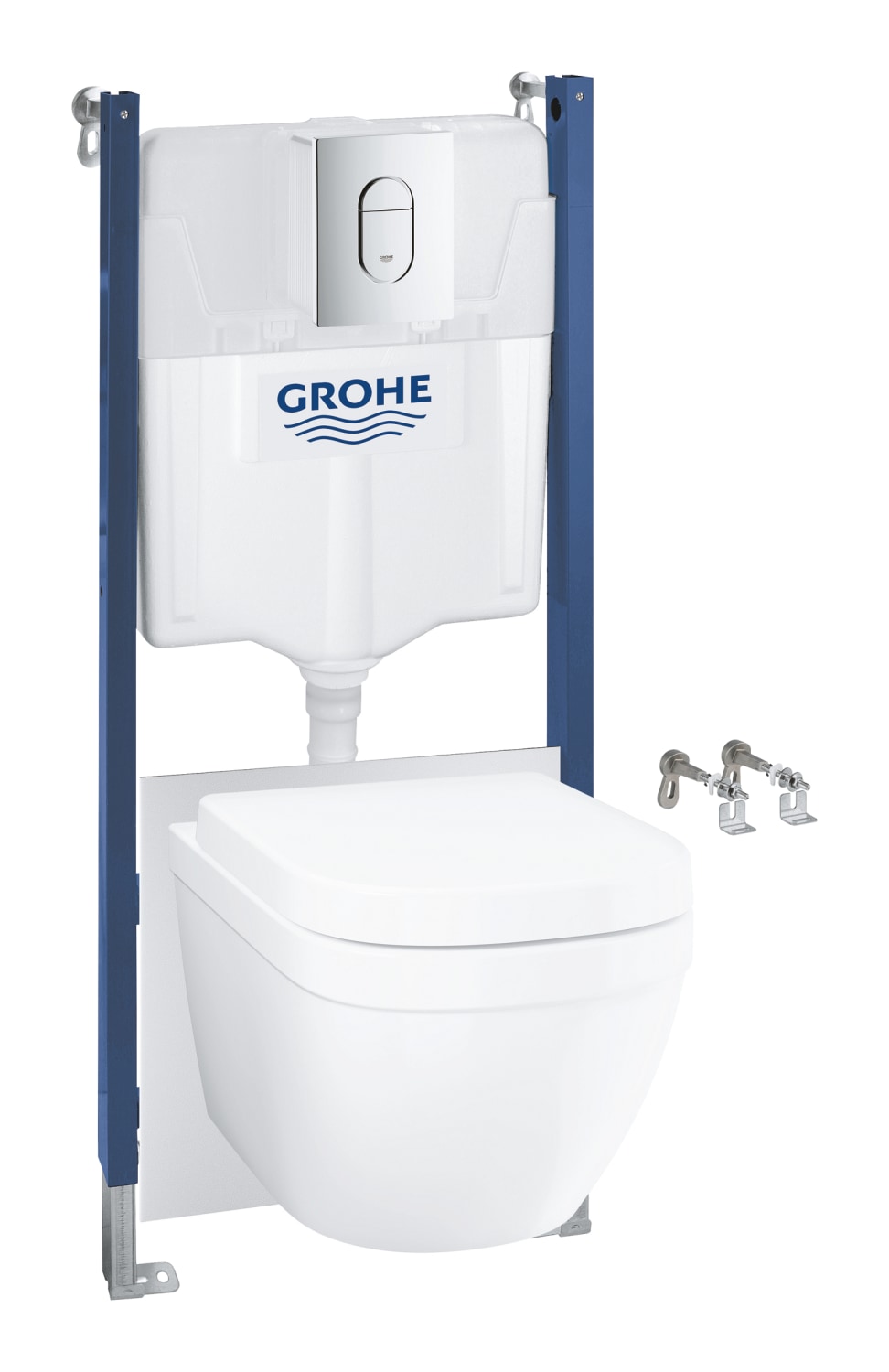 Grohe Solido Euro Ceramic er et væghængt toiletsystem, der kombinerer komfort og funktionalitet i et stilrent design. Dette sæt inkluderer et hængetoilet med toiletsæde og en indbygningscisterne, hvilket giver en komplet løsning til dit badeværelse.
