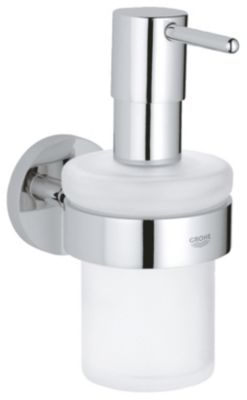 Stilfuld sæbedispenser fra GROHE i krom med glasbeholder og holder. Perfekt til badeværelset.