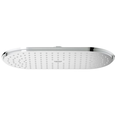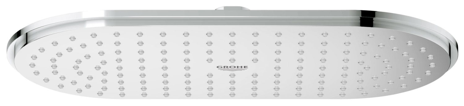 Grohe Veris 300 hovedbruser i krom med kugleled, vridningsvinkel og antikalksystem. Mål: 300 x 150 mm.