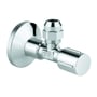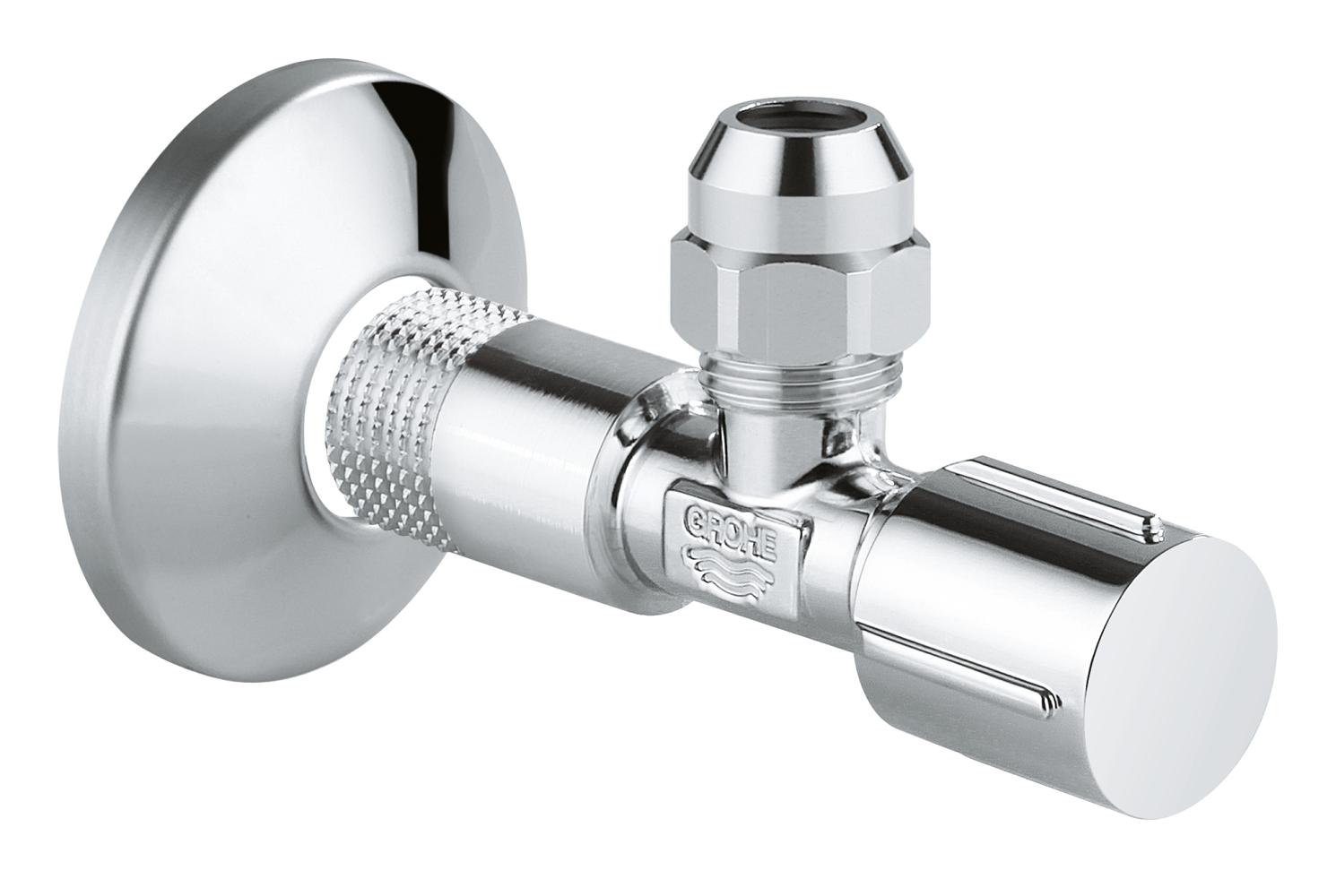 Grohe vinkelventil DN 15 med riflet gevind for nemmere pakning, vægtilslutning 1/2", udløb 3/8" gevind, længdekompensation og kompressionsfitting Ø 10mm.