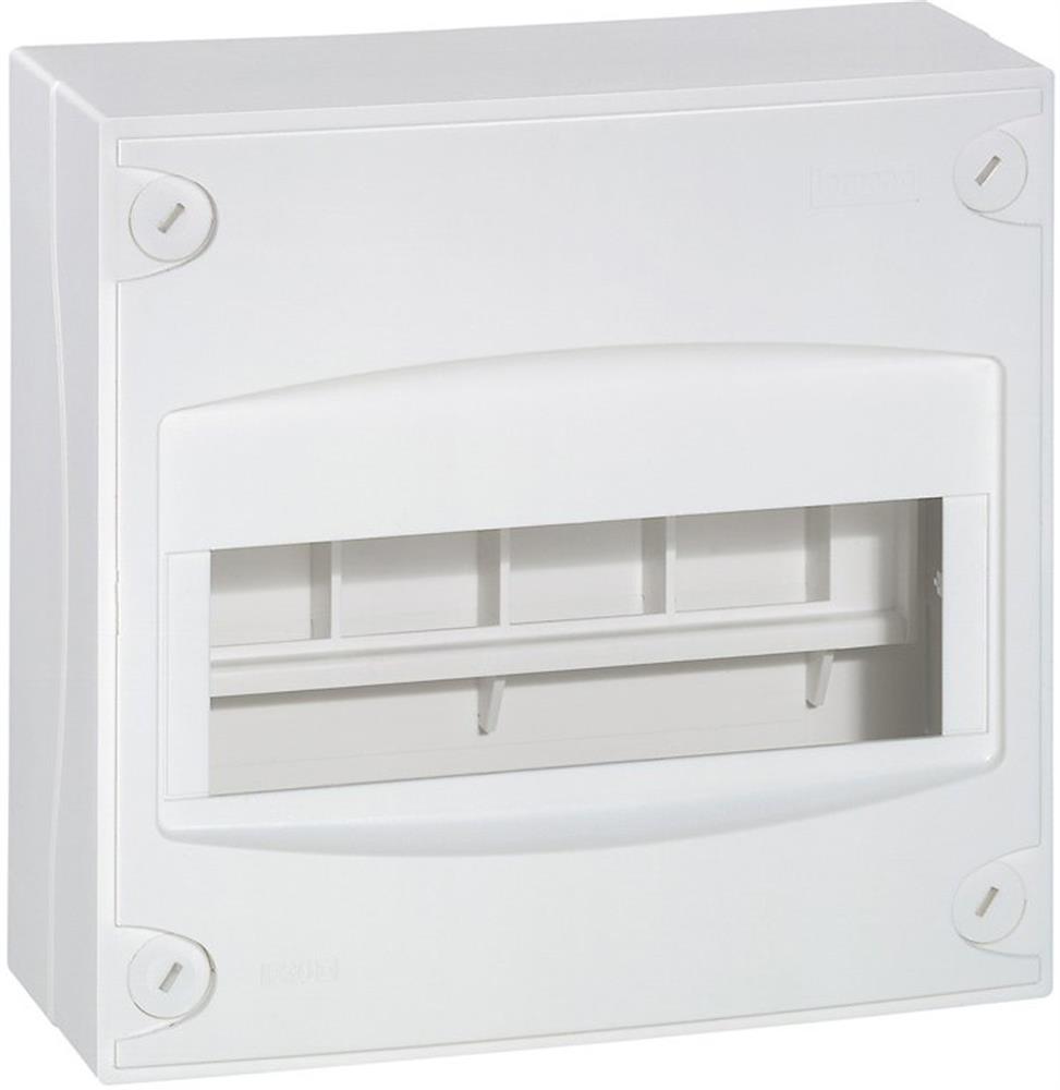 Gruppeafdækning fra Legrand i hvid (RAL 9010). Klasse II, IP30. Forsynet med jordklemmerække og låg, der kan forsegles.