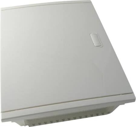 Gruppeafdækning til indbygning i lette skillevægge eller murværk. 2 rækker med 12 moduler pr. række (+ 2 blændplader). Med hvid plastlåge og isolerede terminaler i IP20.