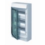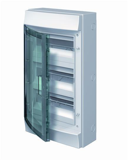 Robust gruppetavle med 36 moduler og 3 rækker. Den har en blå-grøn låge og en tæthedsklasse på IP65. Farven er RAL 9016 hvid.