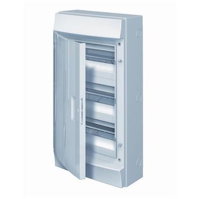 Denne gruppefordelingstavle er en vægmonteret løsning fra MISTRAL65-serien, designet til at opfylde høje krav til beskyttelse og funktionalitet. Tavlen er udstyret med en hvid låge, der giver et rent og diskret udseende, samtidig med at den beskytter de indvendige komponenter.