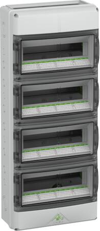 Fordelingstavle i industrikvalitet med åben flange i toppen, 2 rækker, 28 moduler, 150 mm skinneafstand og integreret ventilation. Modvirker kondens og har elastiske indføringer.