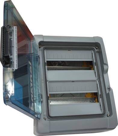 Vandtæt gruppetavle (IP65) med vendbar dør og 2-positions DIN-skinner til større produkter. Leveres med jordklemmer.