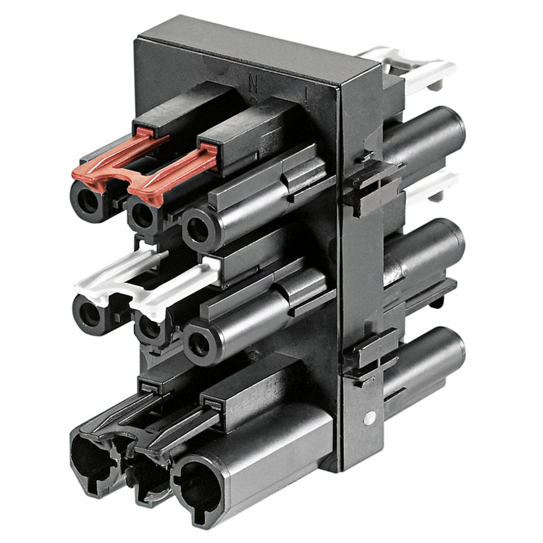 3-polet GST18i3 fordelerblok for omskifter, 250V/20A, 1 indgang / 3 udgange, i sort udførelse.