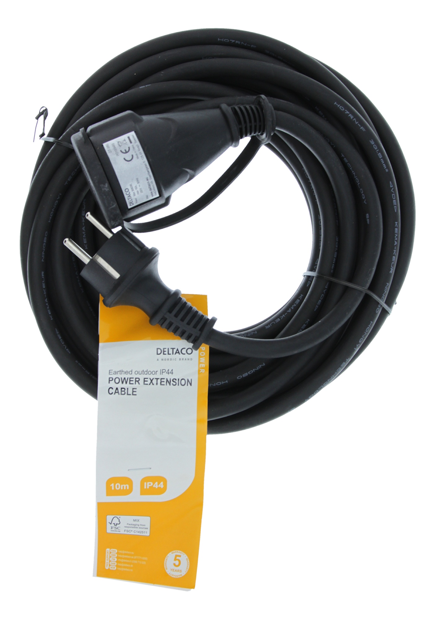 Denne forlængerledning er designet til sikker brug udendørs. Den er jordforbundet og har en IP44-klassificering, hvilket betyder, at den er beskyttet mod indtrængen af faste genstande større end 1 mm og mod vandsprøjt fra alle retninger. Stikket er børnesikret for ekstra sikkerhed.