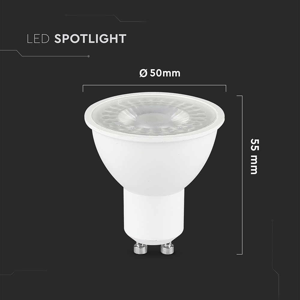 Dette GU10 spotlys er fremstillet af holdbart plastik og leverer et effektivt lys med et forbrug på kun 7,5W. Med en lysstyrke på 610 lumen og en farvetemperatur på 4000K opnås et neutralt og behageligt lys, der passer til mange forskellige miljøer.