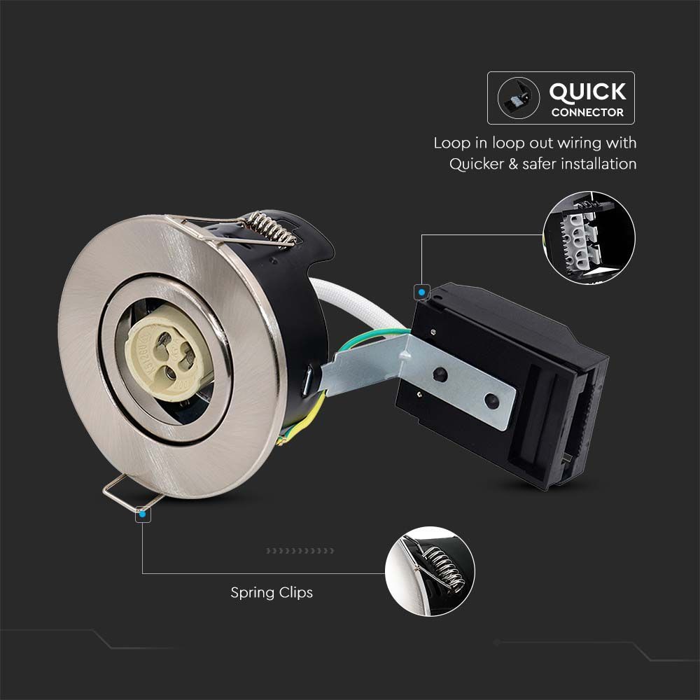 Dette GU10 indbygningsspot er fremstillet af aluminium og har en elegant satin nikkel finish. Med en IP20 klassifikation er det ideelt til brug i tørre indendørs miljøer.