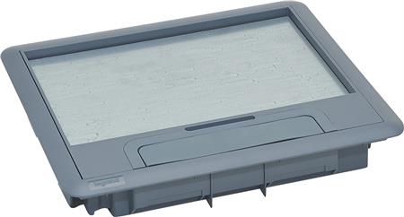Gråt plastlåg (RAL 7031) med trimramme til 12/18 modulers gulvbokse, beregnet til tæpper op til 8 mm. Kompatibel med gulvbokse 88021, 88024 og 88040.