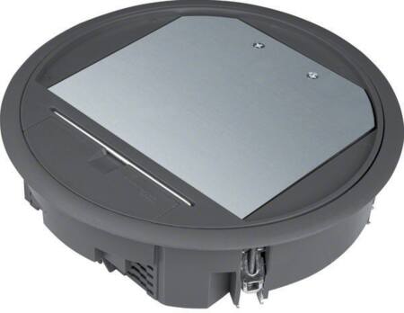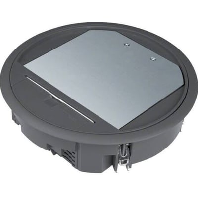Gulvboks R06 med tæppebeskyttelsesramme til 5 mm belægningstykkelse. Farve: dybsort RAL 9005. Universal fastgørelsessæt til indbygning i gulvdåser, kanalsystemer, dobbelt- eller hulrumsgulve.
