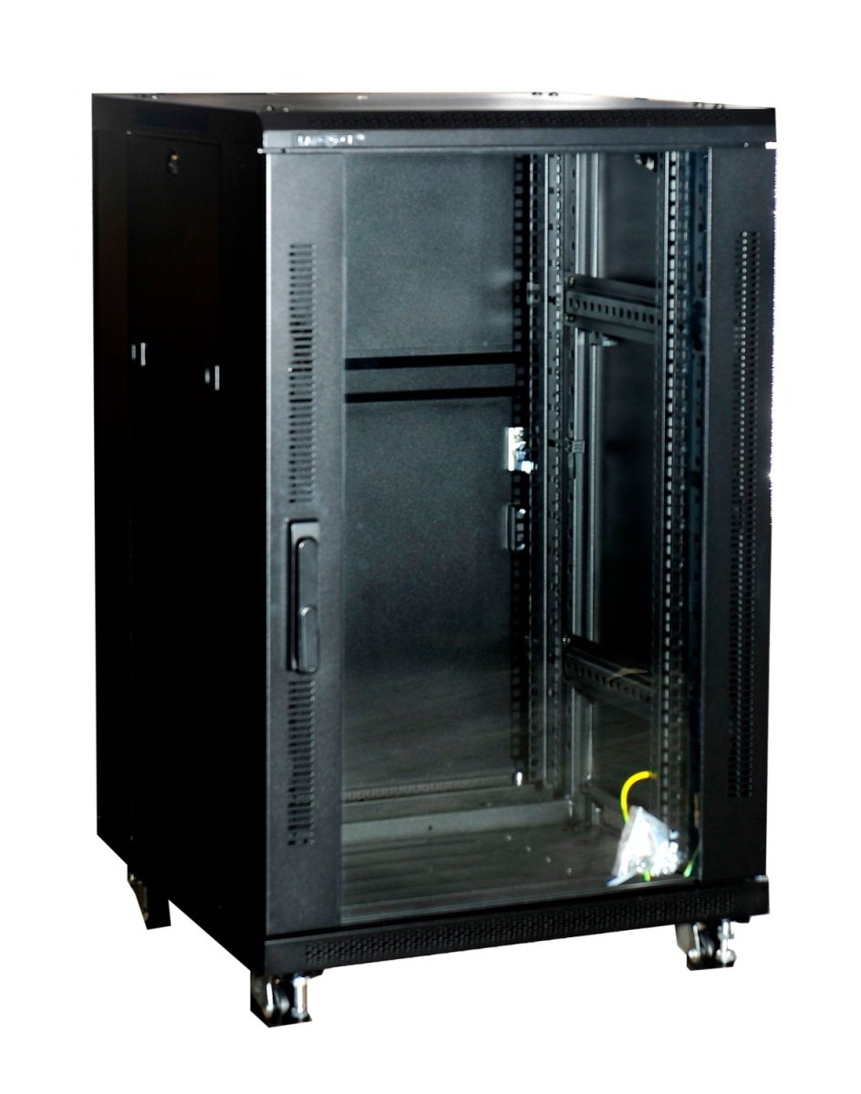 Gulvracket er fremstillet af pulverlakeret stål (1,5 mm tykkelse) i en elegant sort farve. Glasdøren giver et professionelt udseende og mulighed for visuel inspektion af udstyret. Låsen er en 1-punkts vridergreb Eurolock, og racket er forberedt for Ruko låsesystem.