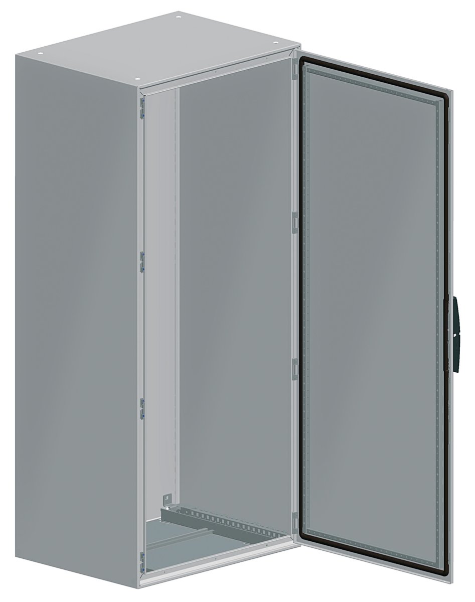 Kompakt gulvskab i stål (grå RAL 7035) med montageplade. Robust konstruktion med IP55 og IK10 beskyttelse. Dimensioner: 2000x800x400 mm.