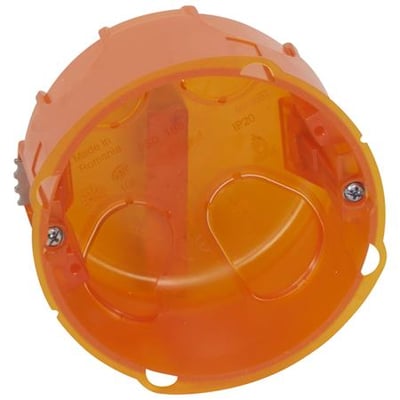 Multibagboks til gulvstik fra Legrand. Til montering i væg eller møbler. Simpel Batibox indbygningsboks, Ø80 mm og 50 mm dybde. Passer til flere gulv/væg udtag.