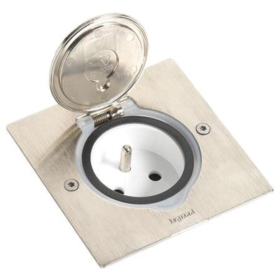 Firkantet gulvstik fra Legrand med rustfri stål coating. Designet til nem montering af Mosaic produkter.