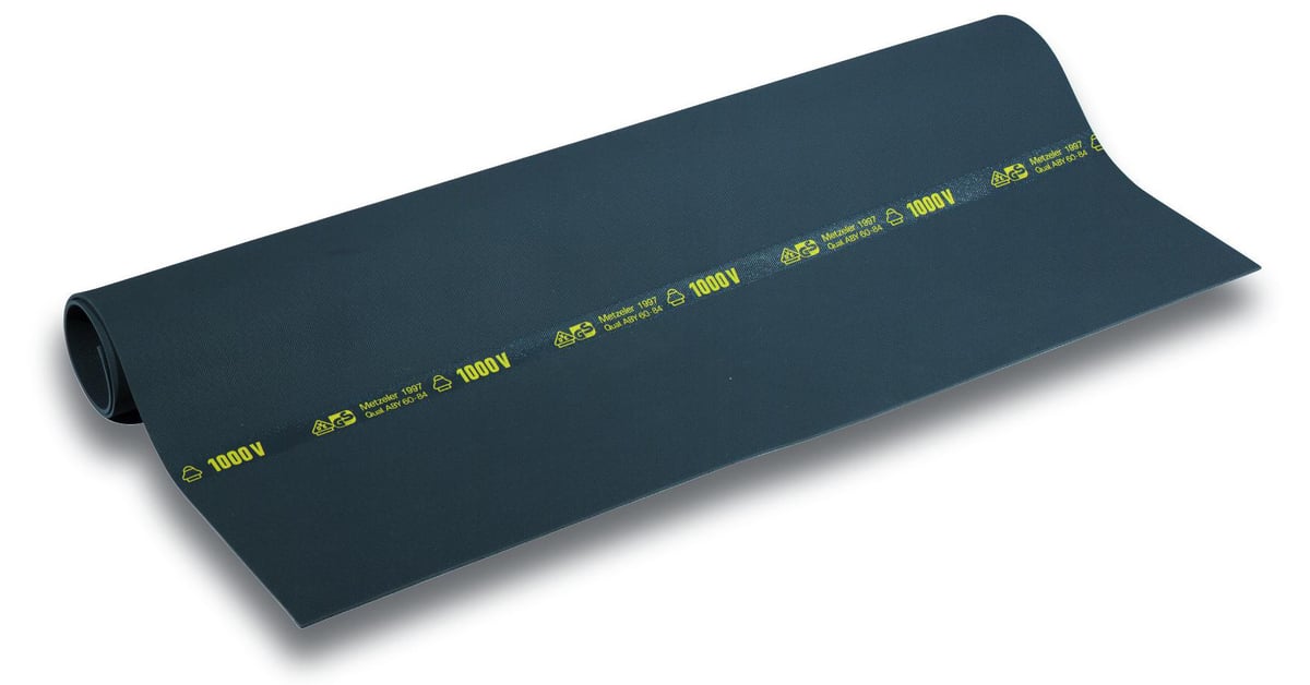 Isolerende gummimåtte fra LAUS, der beskytter i elektriske områder. Måtten har en overflademodstand på ca. 1012 ohm/cm og en dielektrisk styrke på 16,4 kV/mm.
