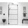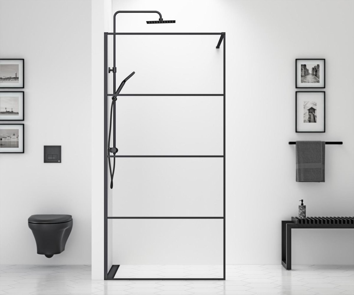 Gustavsberg Square sort brusevæg på 80 cm med sorte rammer og profiler. Består af 6 mm hærdet glas og matsort anodiseret aluminium.