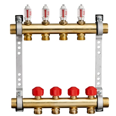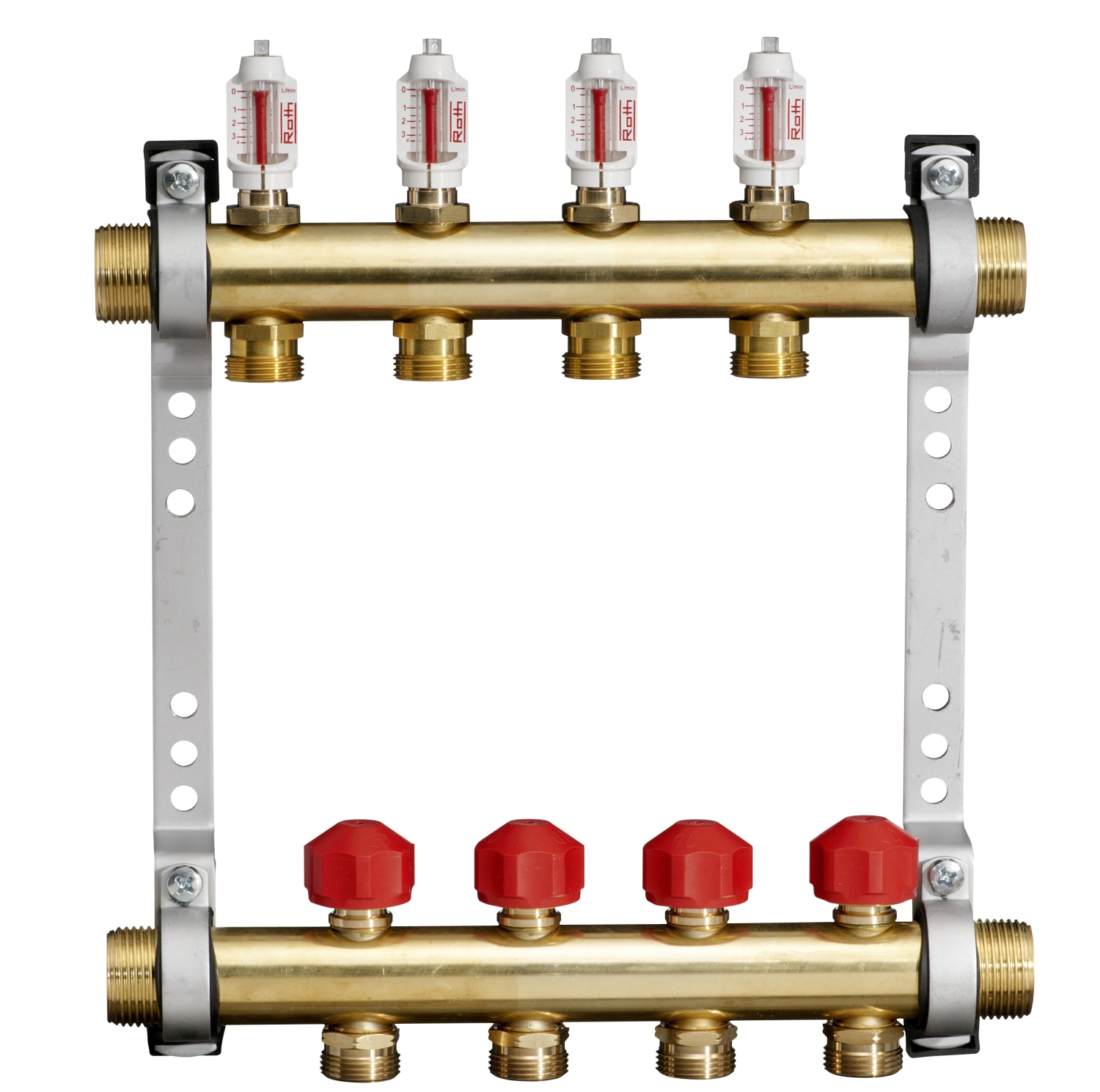 Roth gulvvarmefordeler med frem og retur. Flowmåleren viser aktuel vandflow i de enkelte kredse. Perfekt til styring af gulvvarme.