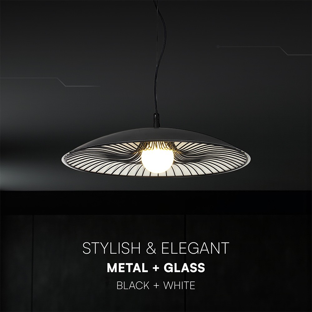 Denne dekorative hængelampe, model VT-89019, kombinerer et stilfuldt sort og hvidt design med funktionalitet. Lampen er ideel til at tilføje et unikt præg til ethvert rum.