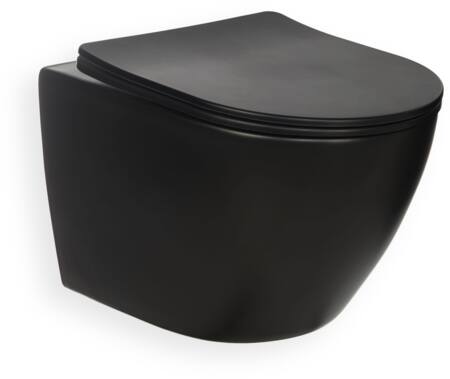 Mat sort Rimfree hængeskål inkl. toiletsæde med Soft Close & Quick Release. Boltafstand 180 mm, dybde 490 mm.