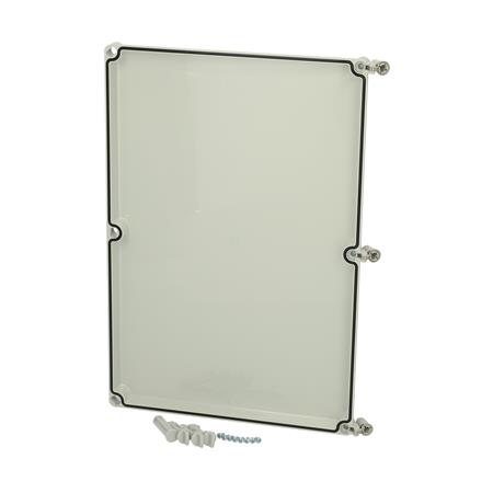 Dæksel med hængsler, EK SOLID, i polycarbonat. Findes i grå eller klar transparent udførelse. Leveres inkl. fingerskruer og i tæthedsklasse IP65.