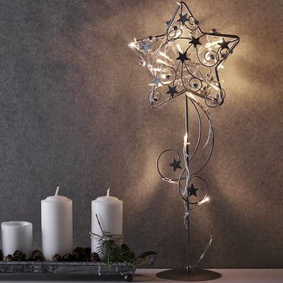 Hagaberg Stjerne bordlampe i sølv, 45 cm høj, med 20 indbyggede LED-lys. Perfekt til indendørs brug med varmt hvidt lys.