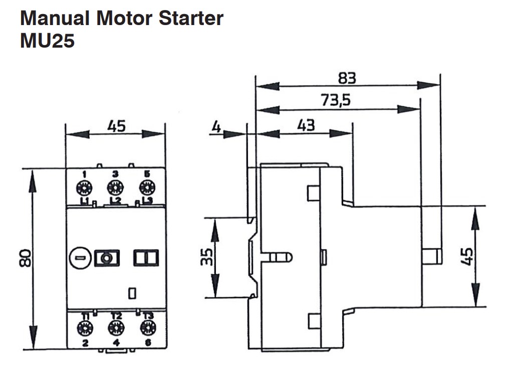 Håndbetjent motorværn til beskyttelse af motor mv. Egensikker op til 6,3A med en kortslutningsbrydeevne på 50kA.