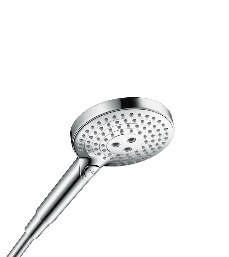 Hansgrohe AX S 120 håndbruser med 3 strålemønstre: Rain, RainAir og WhirlAir. Nemt skift mellem stråler med Select-knap. Vandforbrug: 15 l/min ved 3 bar. Med isoleret vandføring og skylbar smudsfangsi.