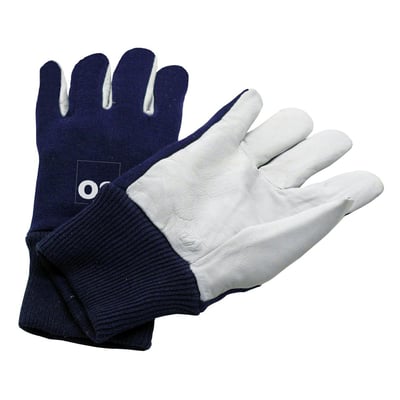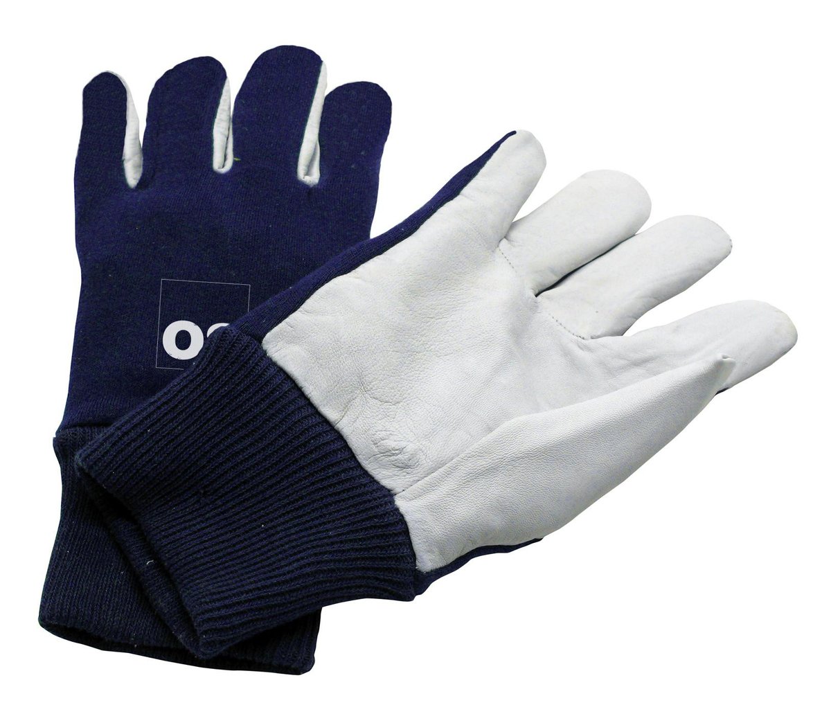 Uforet handske med håndflade af fåreskind og overhånd af bomuldsinterlock samt ribstrikket bomuldskrave. Kategori I, testet iht. EN 420, kvalitet C/D.