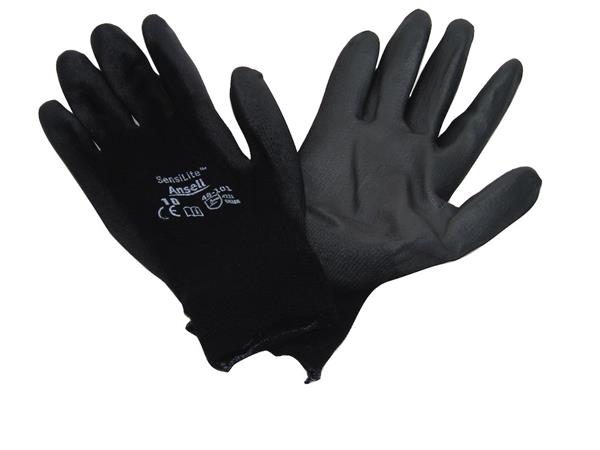 SensiLite® handsker: Tynde, sømløse, slidstærke og fleksible med stor fingerføling. Halvdyppede med glat PU-belægning. Kategori II godkendt iht. EN388.