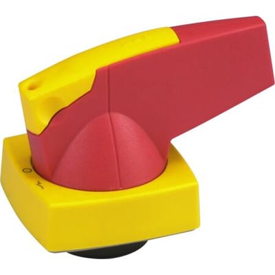 Håndtag K1 rød/gul med kobling 0-1, aksel 6x6mm, 50x50mm. Monteres i Ø32mm hul.