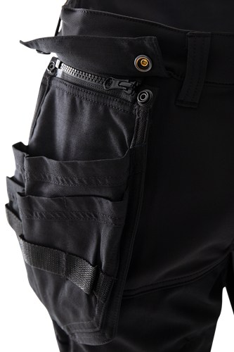 - To aftagelige CORDURA®-forstærkede hængelommer med plads til værktøj og tre mindre lommer samt værktøjsstropper.