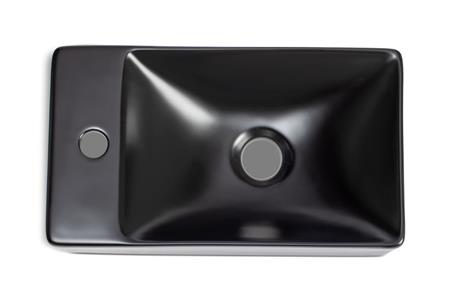 Firkantet keramisk håndvask med hanehul til venstre. Mål: 38x22x10 cm. Uden overløb i mat sort finish.