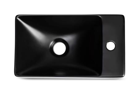Firkantet keramisk håndvask med hanehul til højre. Mål: 38x22x10 cm. Uden overløb og i mat sort finish.