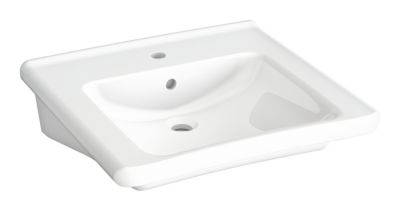 Gustavsberg Public 60 cm håndvask med overløb og hanehul. Rengøringsvenligt, minimalistisk design med grebsliste under vasken. Mål: 600x550x180 mm.