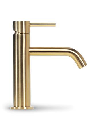 Elegant håndvaskarmatur i børstet guld. Total højde: 173,1 mm. Højde til tud: 82 mm. Tud fremspring: 122,5 mm. Forbrug: 6 l/min.