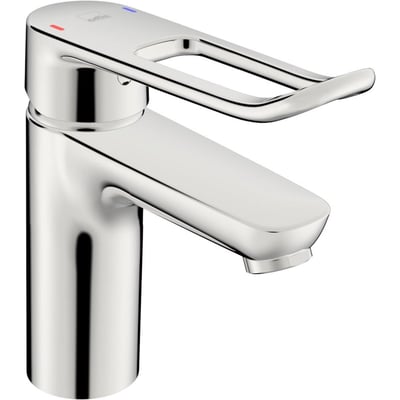 Håndvaskarmatur i forkromet finish med bøjlegreb. Uden bundventil og med mulighed for vandbesparende funktion. Fleksible tilslutningsslanger medfølger.