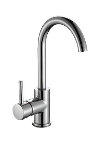 Elegant håndvaskarmatur i krom med C-formet tud. Total højde: 301 mm, højde til tud: 210,5 mm, tud fremspring: 155 mm. Vandforbrug: 6 l/min.