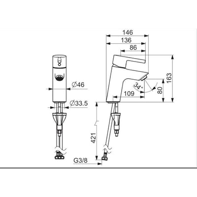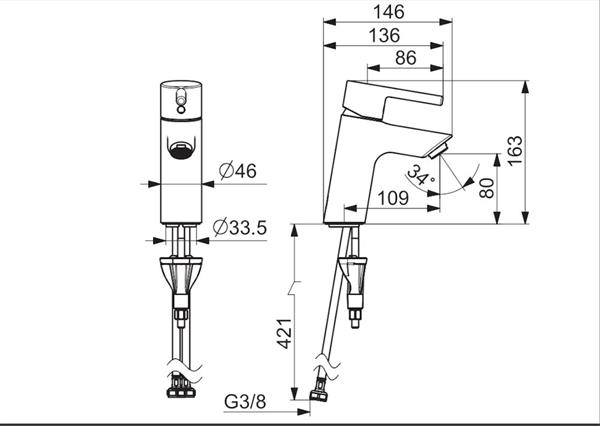 Armaturet har en byggehøjde på 163 mm og et fremspring på 109 mm, hvilket giver god plads ved vasken. Udløbshøjden er 80 mm.