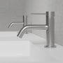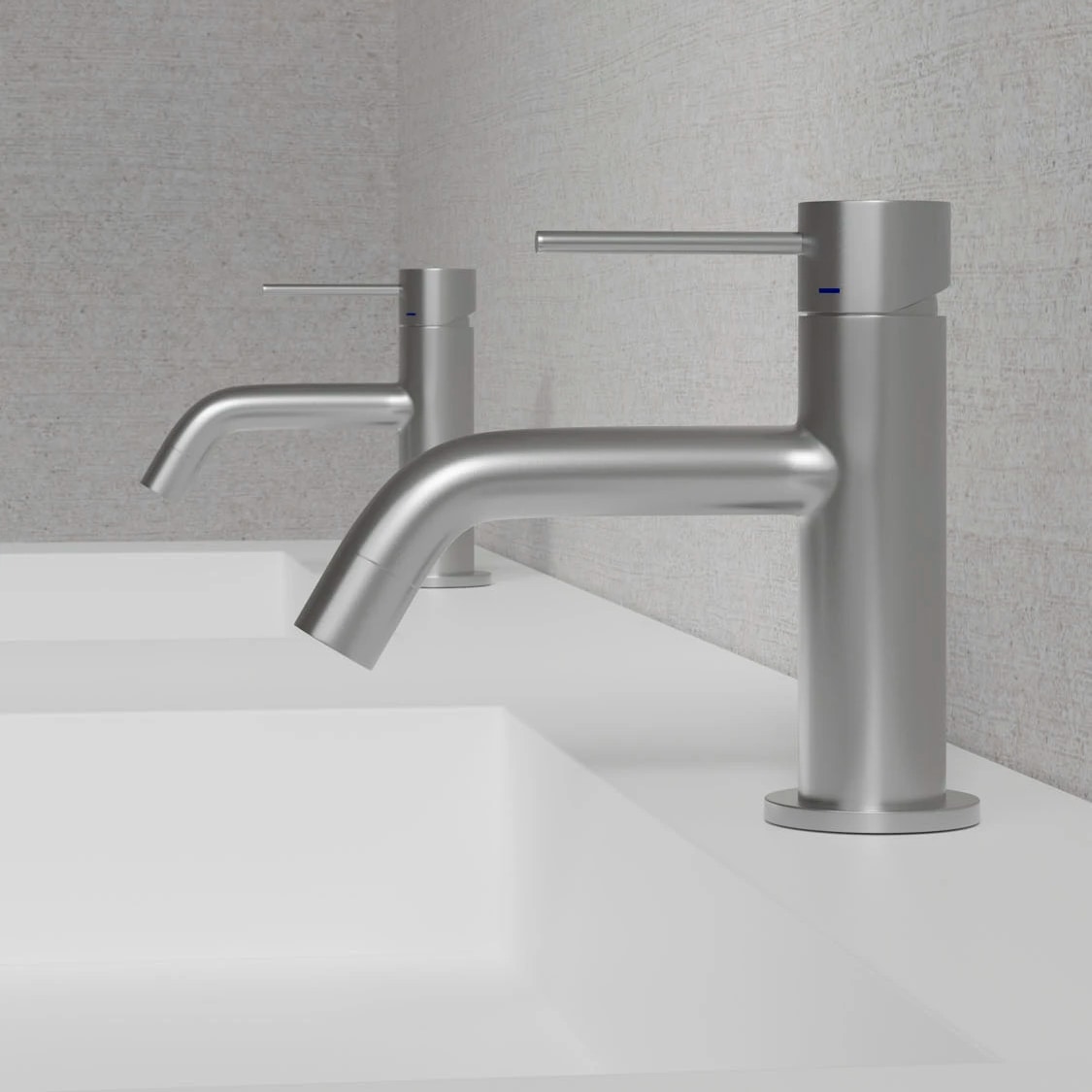 Minimalistisk håndvaskbatteri i rustfrit stål med slanke detaljer. Sparer vand og har perfekt vandflow. Inkl. Neoperl-strålesamler. Hulboring: Ø35 mm.