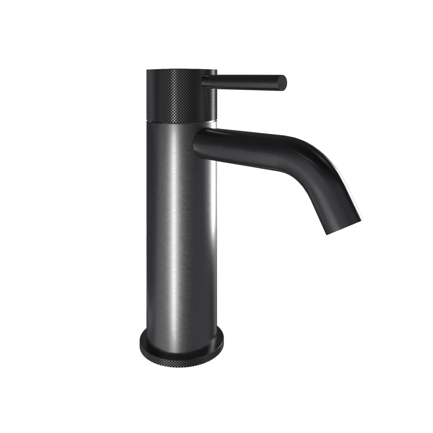 Elegant håndvaskarmatur i blyantssort finish. Fremstillet i messing med 1-grebs betjening og flexslanger.