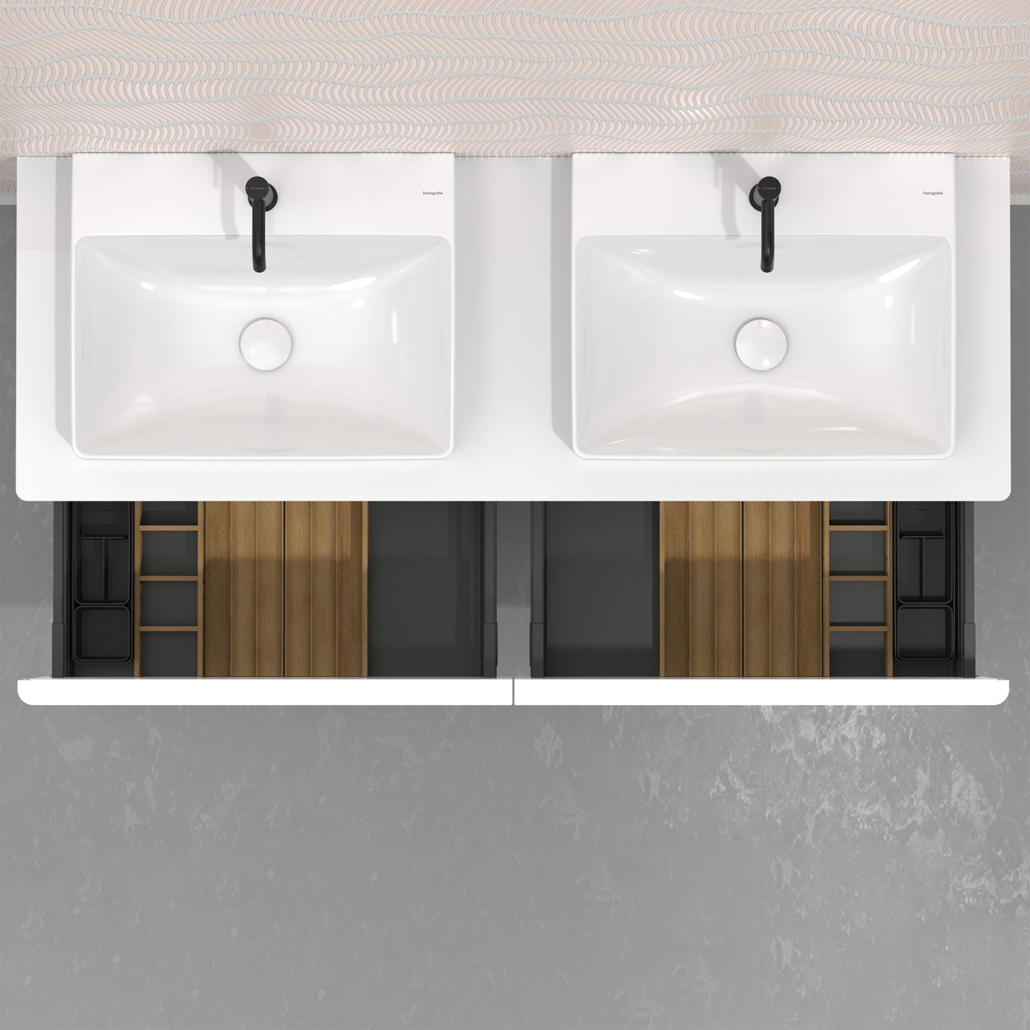 Hansgrohe IntraStoris interiørsæt i eg. Skuffeinddelersæt 340 mm til vaskeskab 780/475, 780/550 og 1560/550 mm. Består af bølgeprofilmodul, sideopstand og rum til små dele.