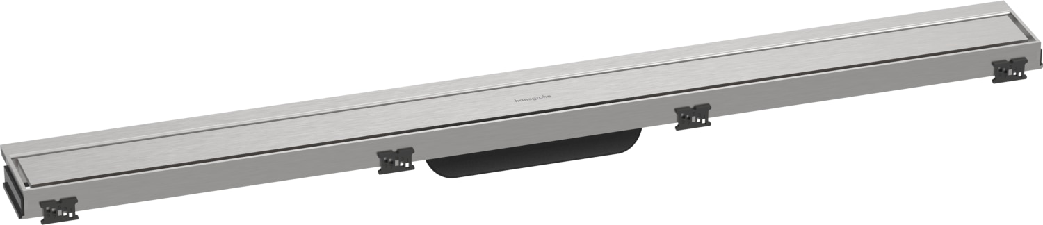 Hansgrohe kappesæt i børstet rustfrit stål. Mål: 900 mm længde, 25 mm højde. Vandret udløb, placeres mod bagvæg.