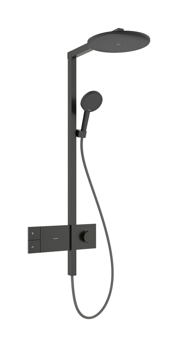 Komplet Hansgrohe Raindance Alive S Showerpipe brusesæt i børstet sort krom. Inkluderer hovedbruser, håndbruser og termostat. Vandbesparende med 7 l/min ved 3 bar og skoldningsspærre.