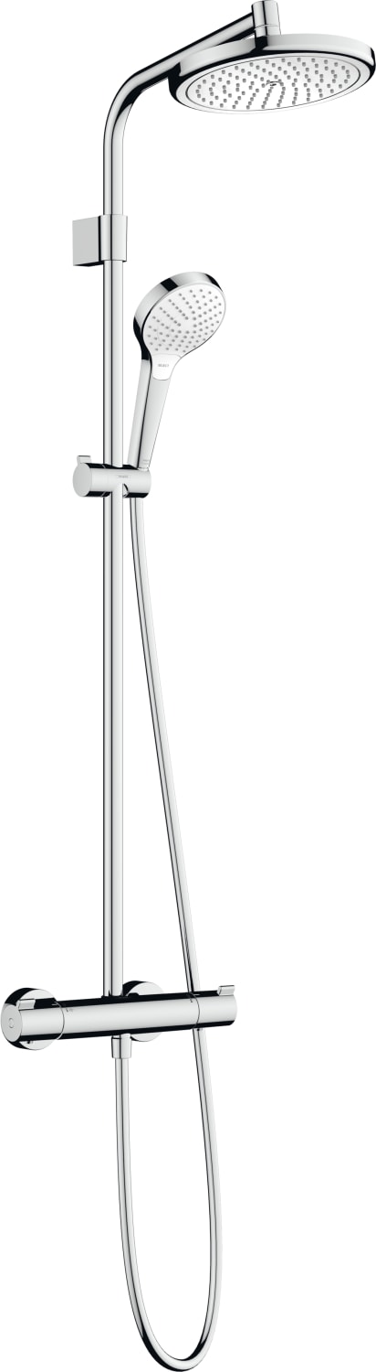 Hansgrohe Waterforms 220 Eco Showerpipe i krom med 2-grebs betjening og termostat. Vandbesparende med 8,7 ltr/min for hovedbruseren.
