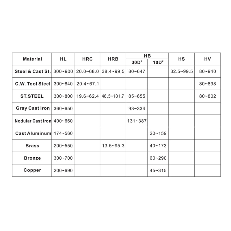 Denne hårdhedstester er designet til at måle metalhårdhed i fem forskellige skalaer: Rockwell, Vickers, Leeb, Brinell og Shore. Derudover differentierer Rockwell-målingen mellem Rockwell B og C (HRB, HRC, HV, HB, HS, HL).