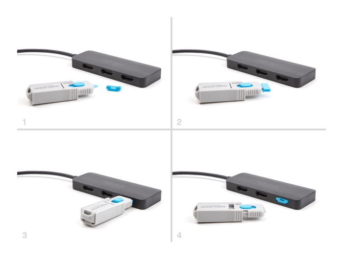 Med dette HDMI port blocker sæt fra Delock kan HDMI porte sikres mod uautoriseret adgang. Blockerne placeres i porten og blokerer for tilslutning.